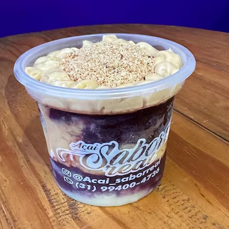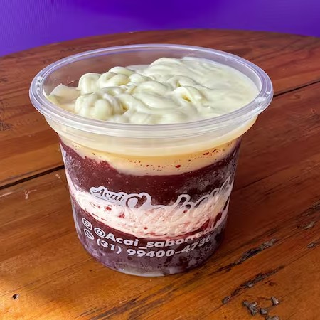 Pote montado em camadas, com nosso açaí cremoso, acompanhado de leite em pó, leite condensado, banana e o saboroso creme de Ninho.