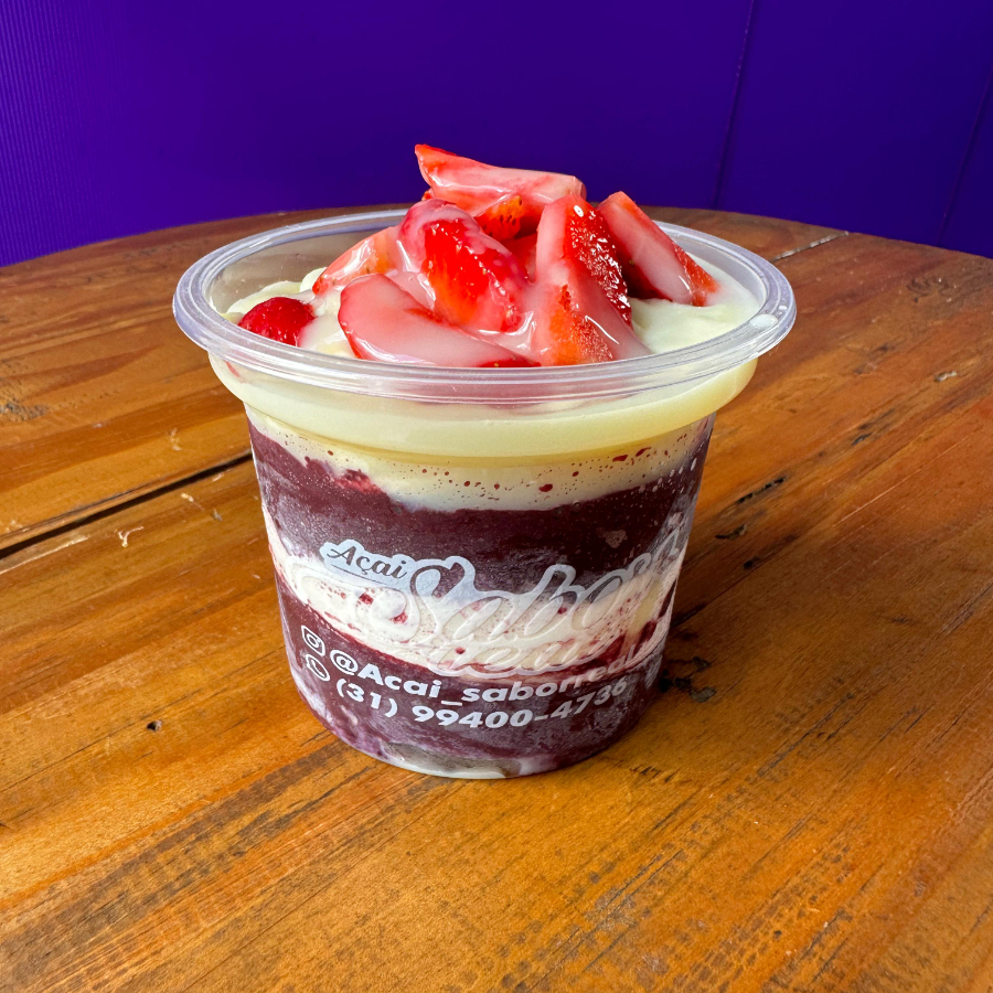 Pote montado em camadas, com nosso açaí cremoso, acompanhado de leite em pó, leite condensado, morango e o saboroso creme de Ninho.