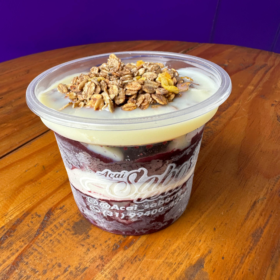 Pote montado em camadas, com nosso açaí cremoso, acompanhado de leite em pó, leite condensado, banana e a granola crocante.