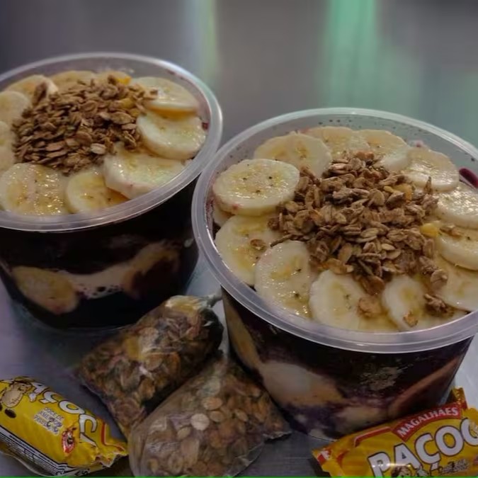 Creme de açaí premium, acompanhado por e sucrilhos para uma pitada de crocância, leite condensado, leite em pó, cobertura saborosa, fatias frescas de banana e paçoca.