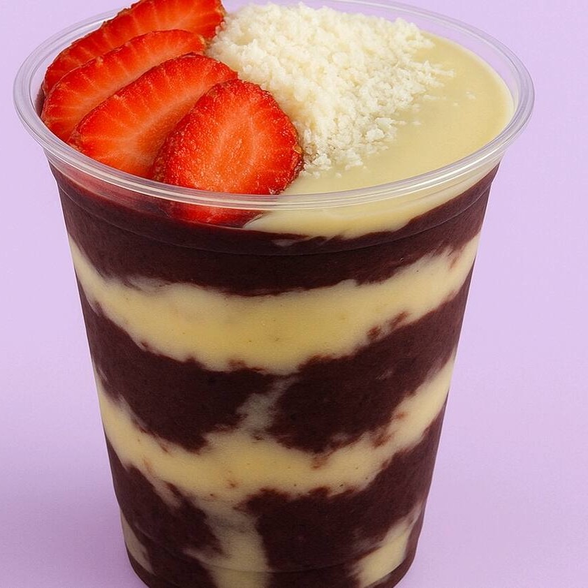 Creme de açaí premium, leite condensado, leite em pó, banana e Morangos