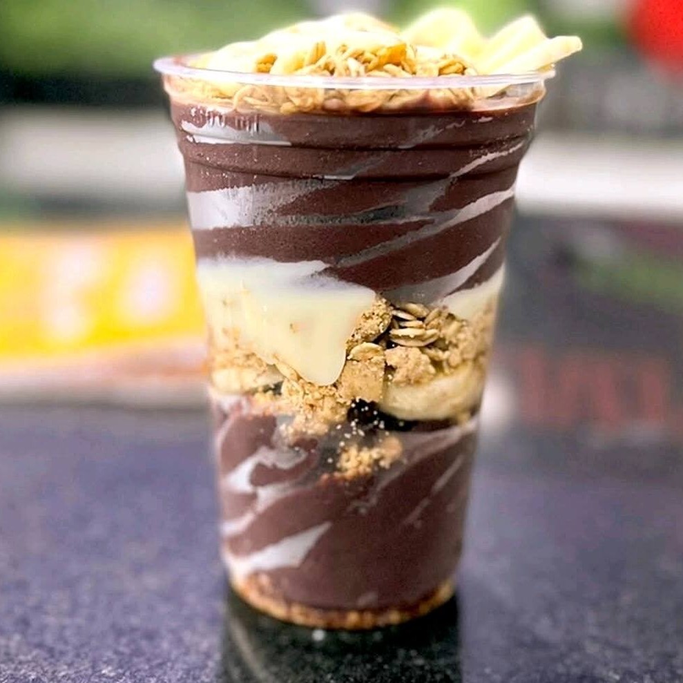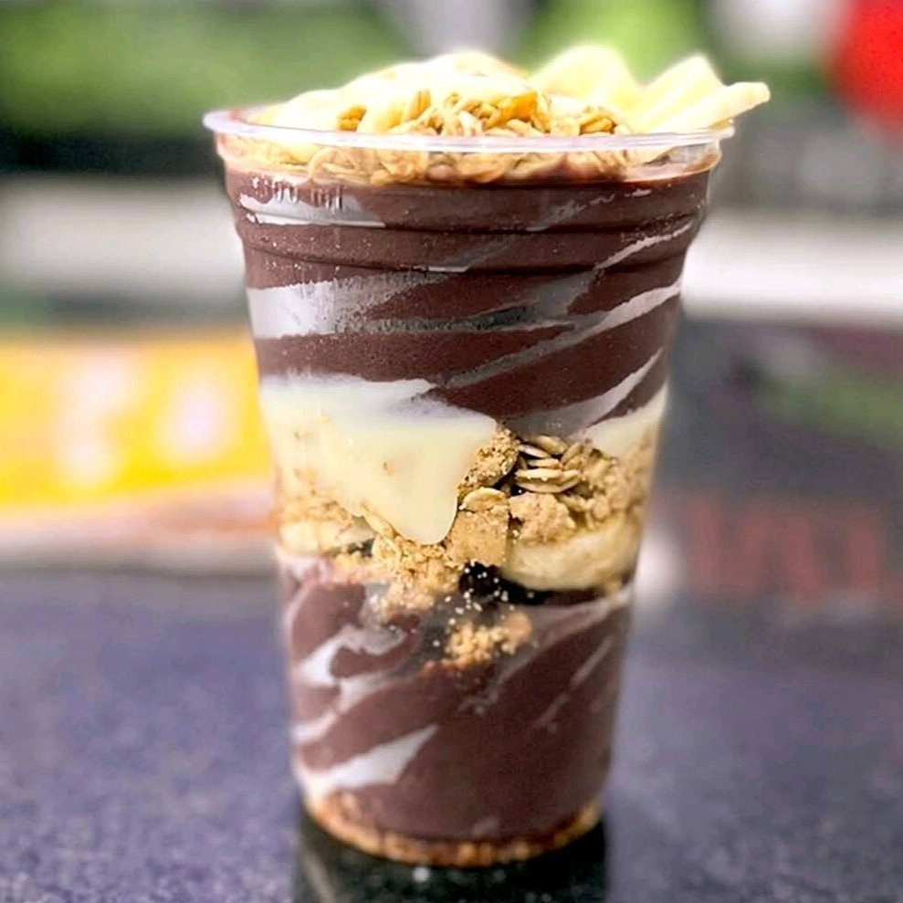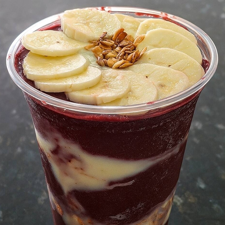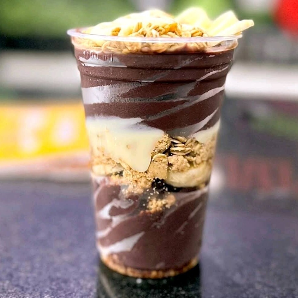Creme de Açaí Premiun, Banana, Granola, Leite em pó, Leite condensado.