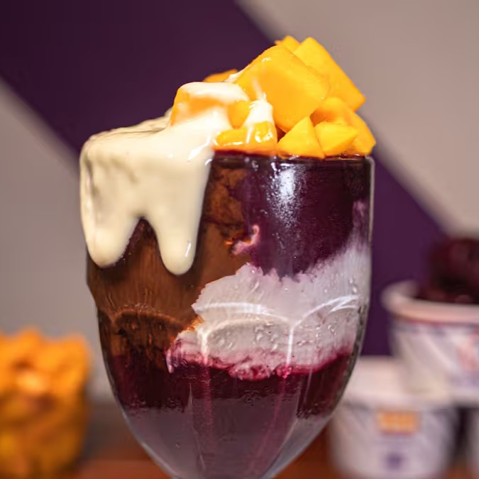 Metade açaí cremoso, metade sorvete e por cima um recheio irresistível.