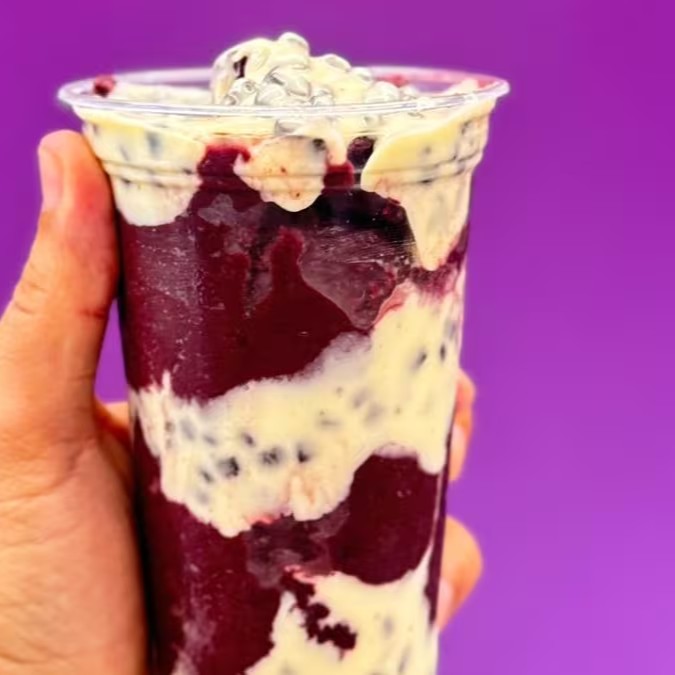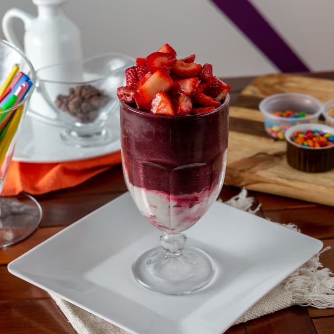 Esta deliciosa e nutritiva vitamina de açaí com duas camadas de recheio, escolhidas por você para enriquecer ainda mais a sua experiência.