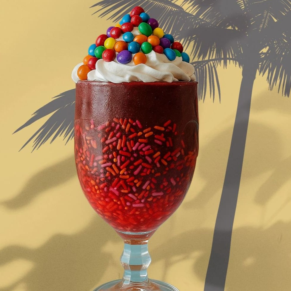 Açaí + cobertura + granulado colorido + chantilly + Confete.