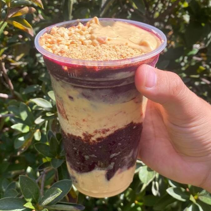 Creme de açai, creme de amendoim irresistivel, paçoca e amendoim.
