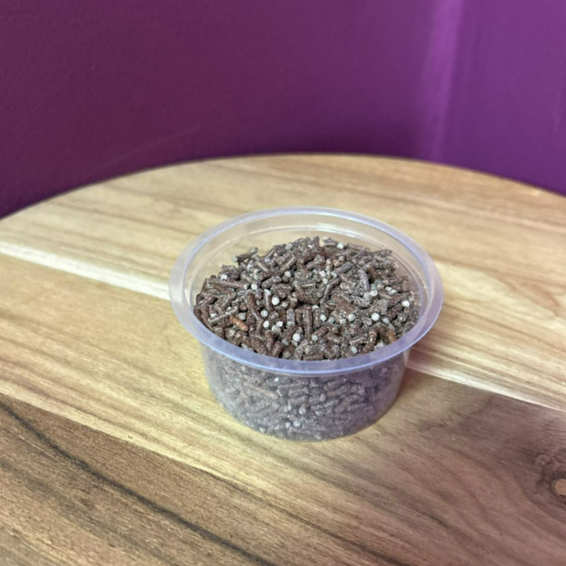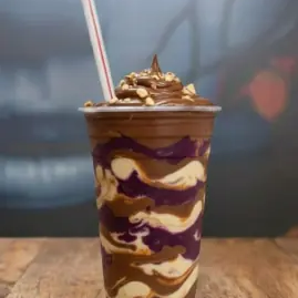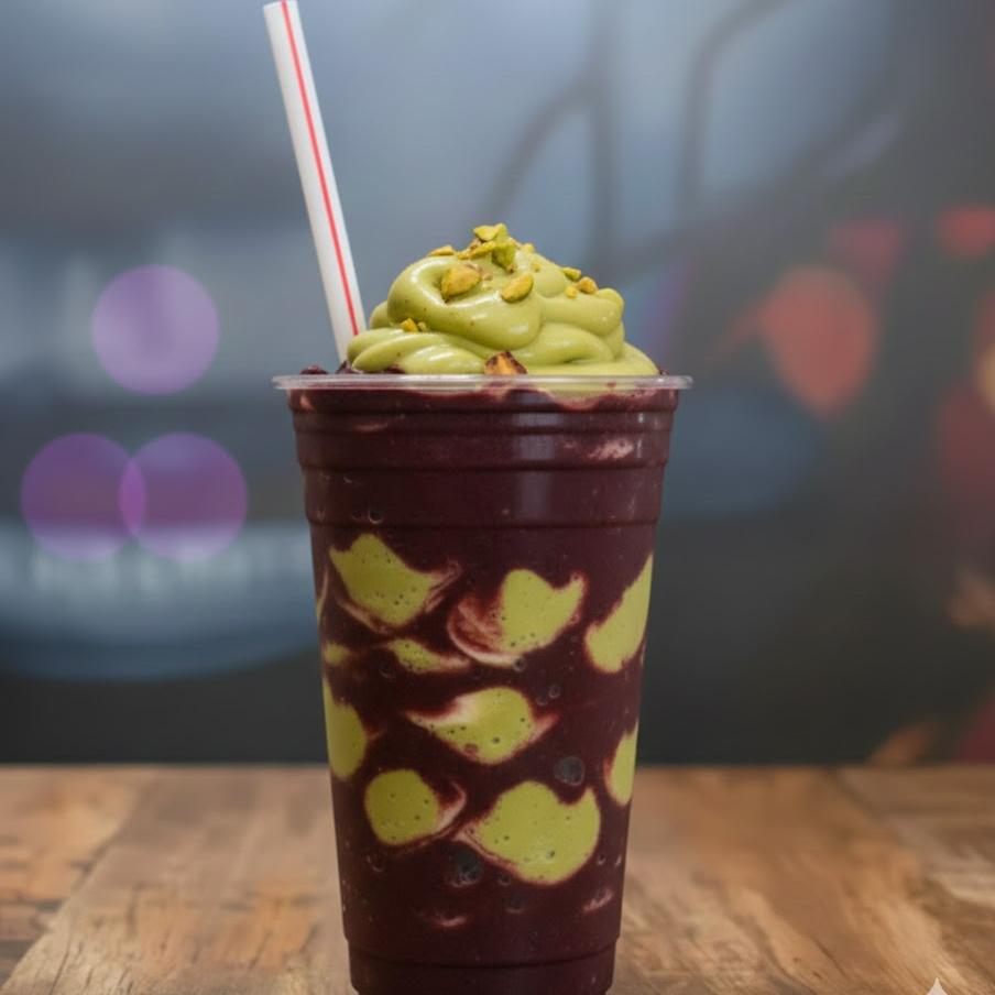 Nossa base é feita com a união aveludada do creme de Açaí e Leite, criando um sabor incrivelmente suave. Adicionamos camadas generosas do nossos cremes Premium PISTACHE + amendoim granulado para um toque de luxo e cremosidade incomparável