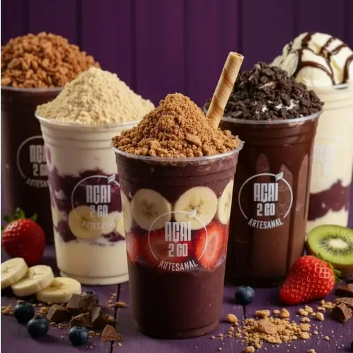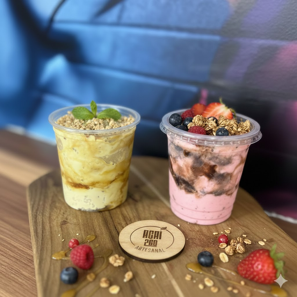Duo Tropical (Açaí + 1 Sabor): O seu par ideal está aqui! Metade Açaí , metade sua escolha. Selecione entre nossos creme ou sorbets disponíveis e monte o seu duo favorito.