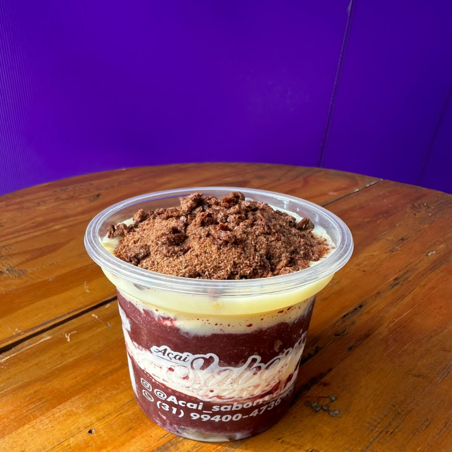Pote montado em camadas, com nosso açaí cremoso, acompanhado de leite em pó, leite condensado, paçoca e o saboroso creme de amendoim. Experimente e descubra o verdadeiro Sabor Real!