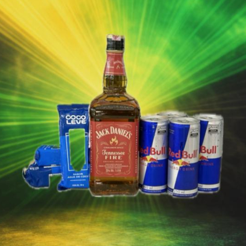Combo Jack Daniels fire + Gelo Coco Leve+ 4 redbull (1 Whisky Jack Daniels fire + 4 Gelos Coco Leve Sabor Coco 190g+ 4Red Bull)