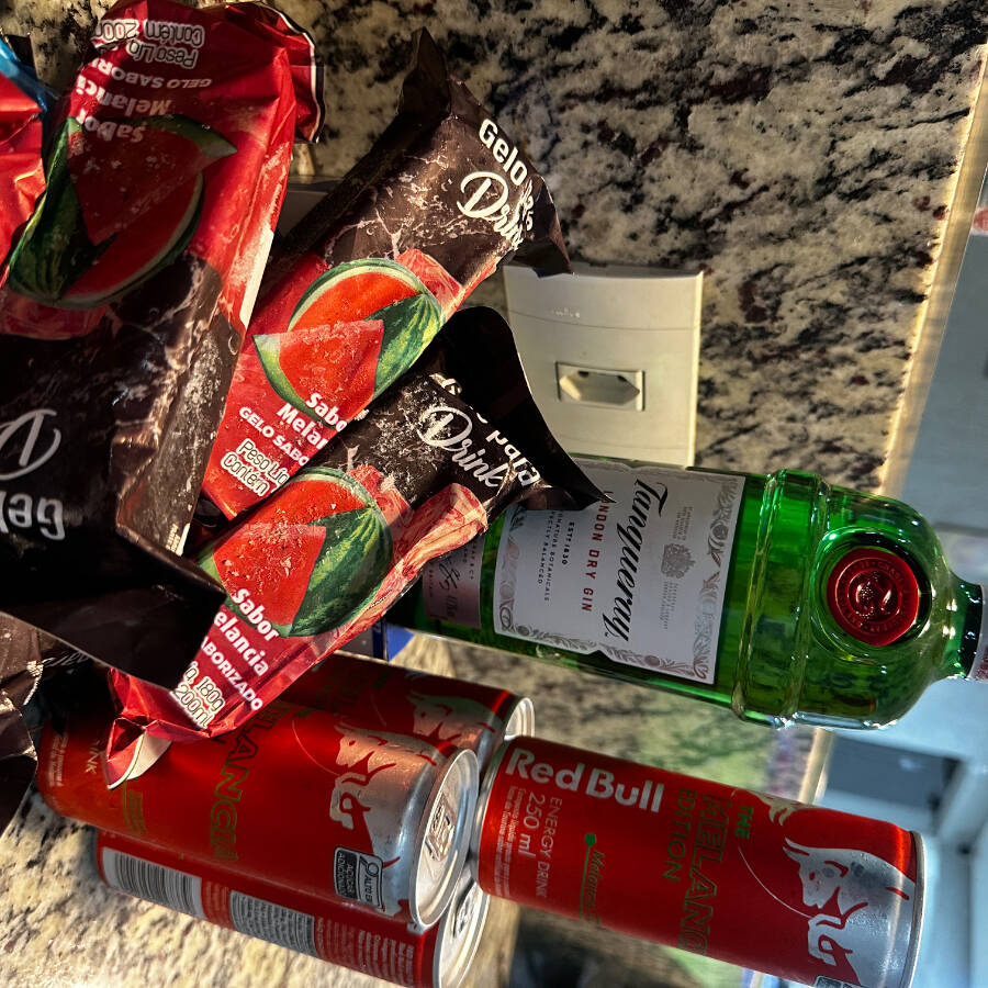 Garrafa tanqueray, 4 gelos, 4 Red Bull