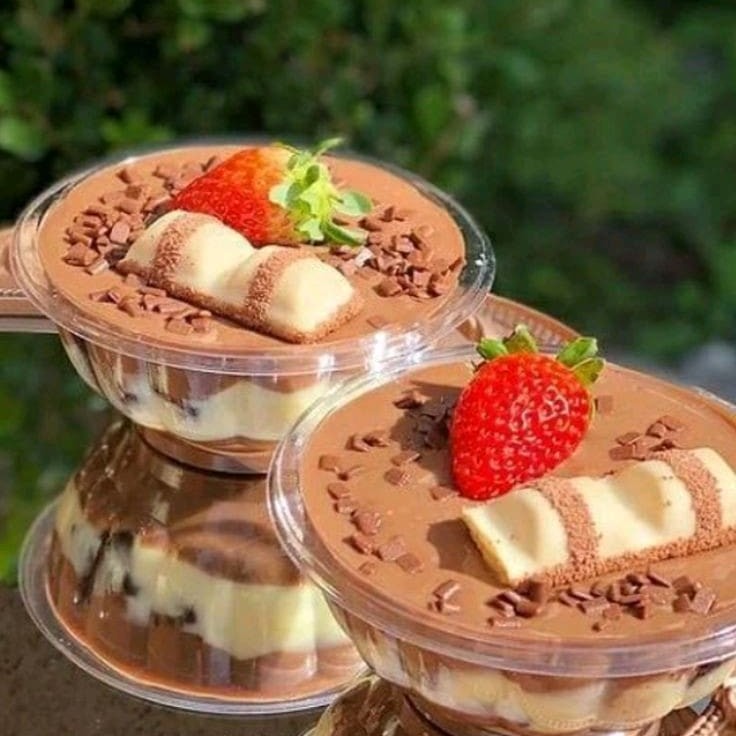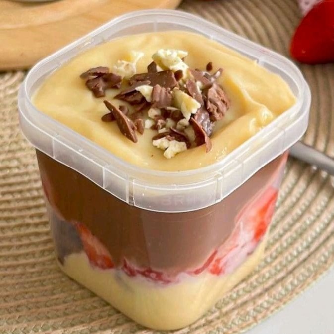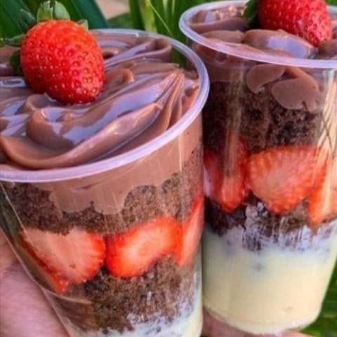 Bolo no pote com nosso delicioso creme de Ninho, chocolate meio amargo, bolo com massa de chocolate e morangos frescos e picados. Finaliza com um morango e granulê melken