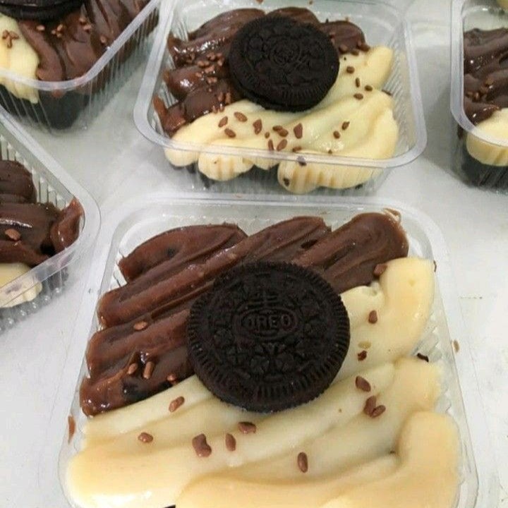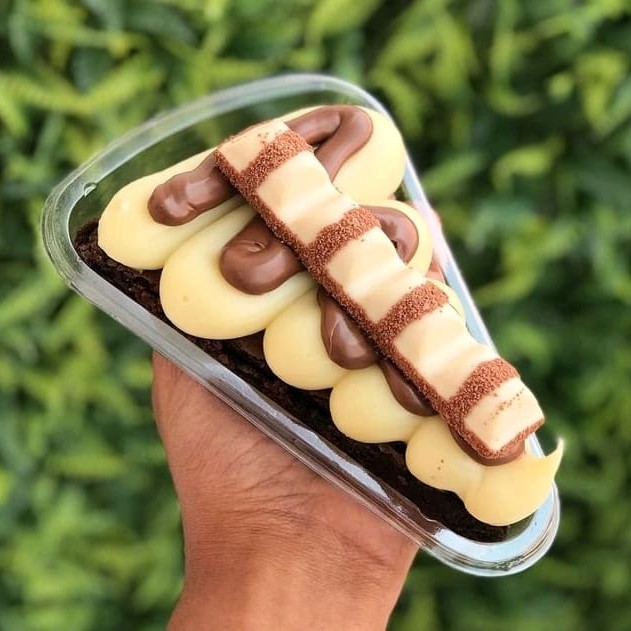 Nesse delicioso pedaço de brownie temos creme de Ninho, creme de brigadeiro, mini Oreo e pedaços de biscoito triturado para finalizar