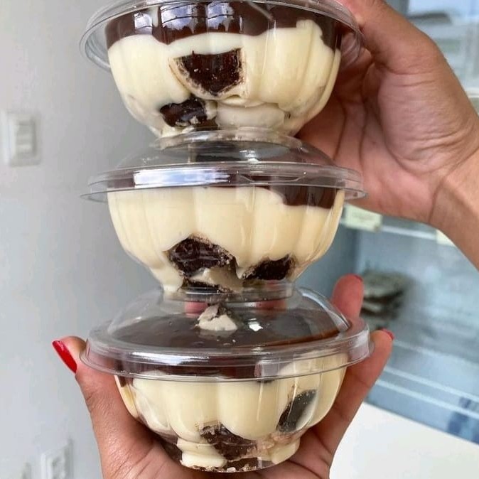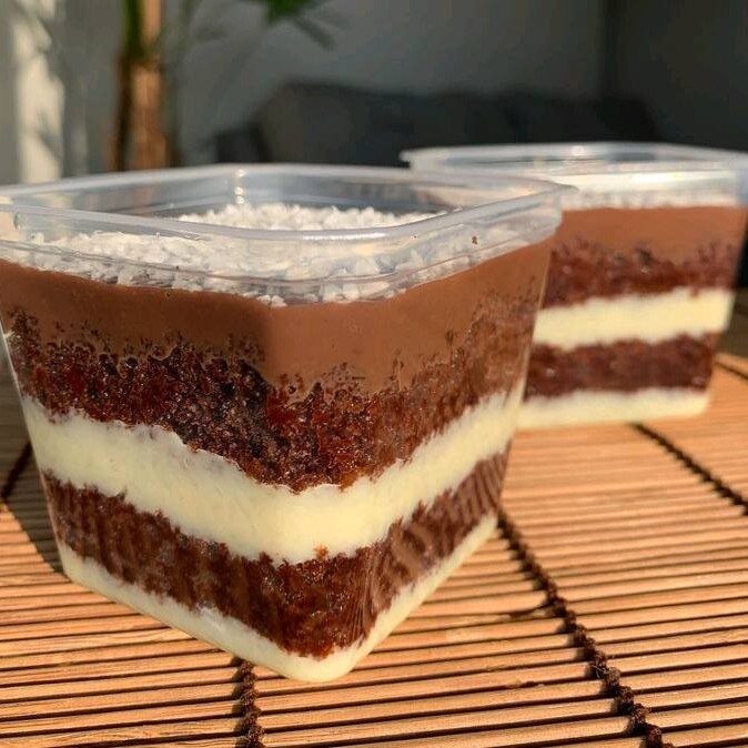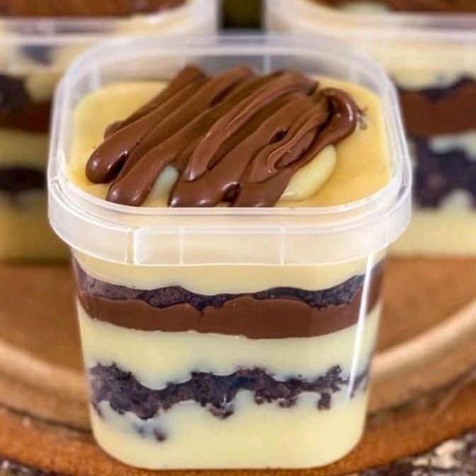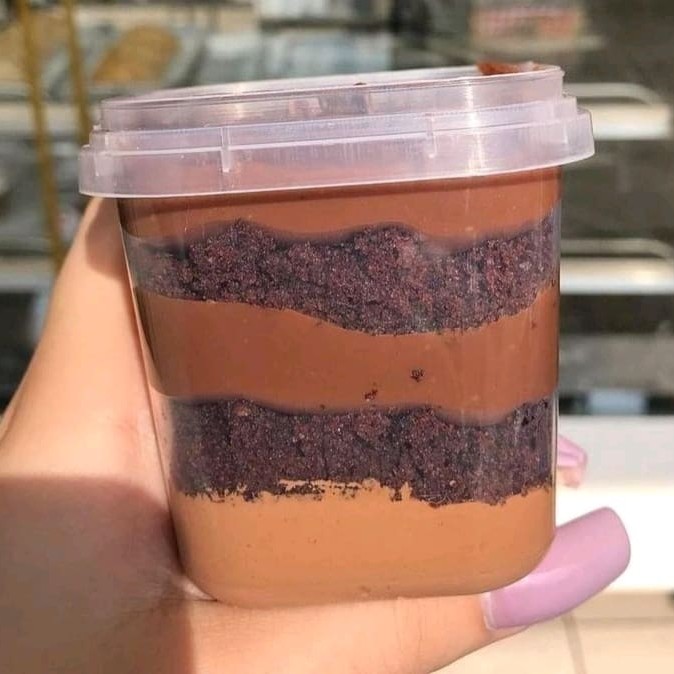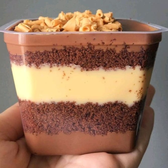 Bolo no pote de 200ml com brigadeiro meio amargo, massa bolo de chocolate, creme de Ninho branco e finaliza com raspas de chocolate branco ( Foto do copo ilustrativa. É possível confirmar os Ml's no próprio copo)