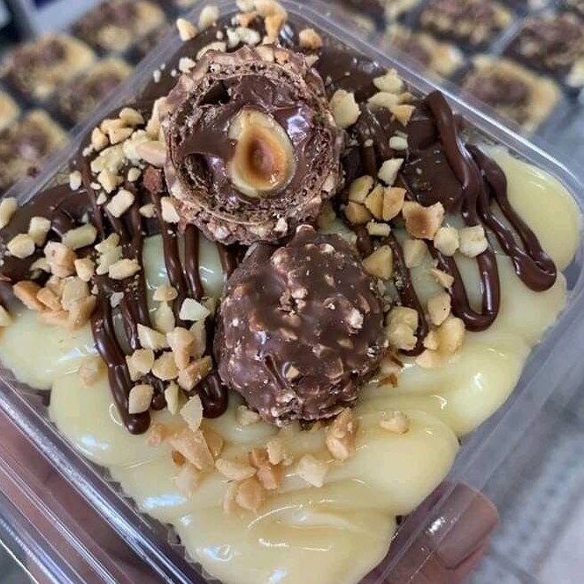 Devido ao grande sucesso que tivemos com nosso copo da felicidade Ferrero branco, decidimos criar o brownie Ferrero branco. Nessa maravilha temos um delicioso pedaço de brownie, recheio de Ninho, Nutella pura e Original, amendoim e 1 Ferrero Rocher por cima para finalizar.