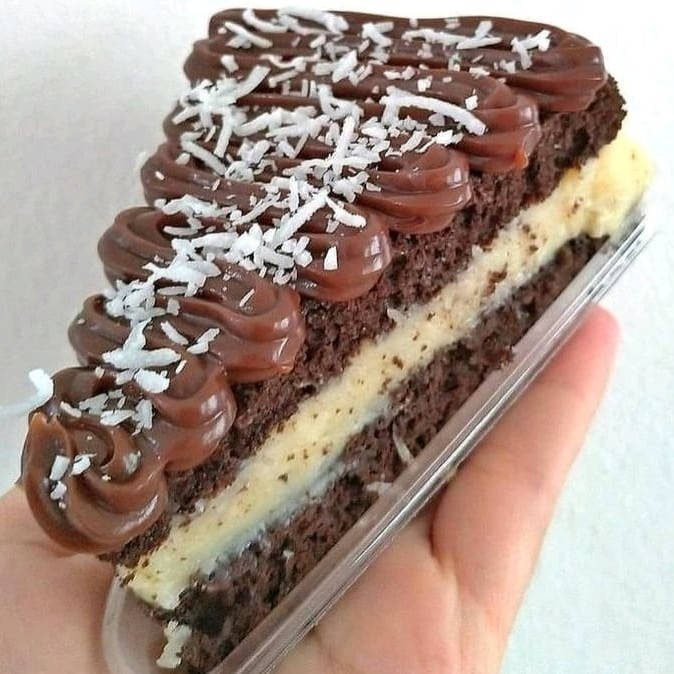 Bolo com massa de chocolate bem molhadinha, recheio de coco no meio e brigadeiro por cima, dando o equilíbrio perfeito. Por cima, temos pedaços de coco ralado por cima