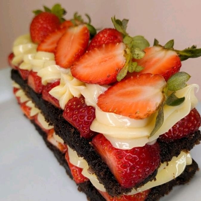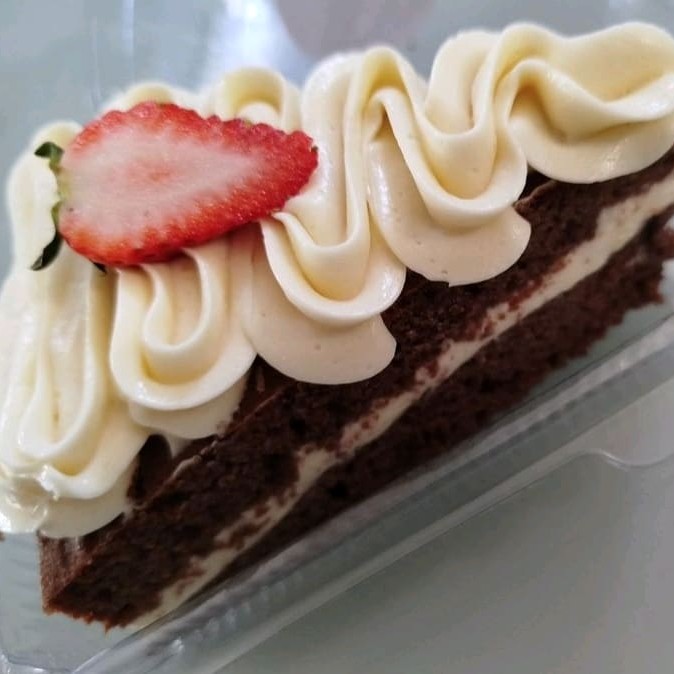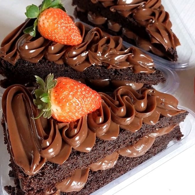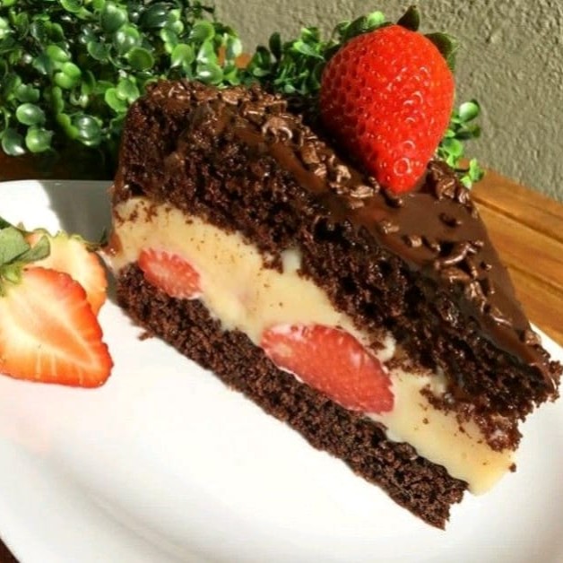 Deliciosa fatia de bolo com massa de chocolate bem molhadinha, com duas camadas de recheio de Ninho e morango. Venha se deliciar com essa super sobremesa