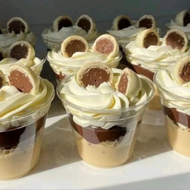Nessa sobremesa P de 250ml, temos creme de Ninho, bombons Ouro Branco picados e brigadeiro meio amargo. Finaliza com bombom Ouro Branco e Granulê melken meio amargo