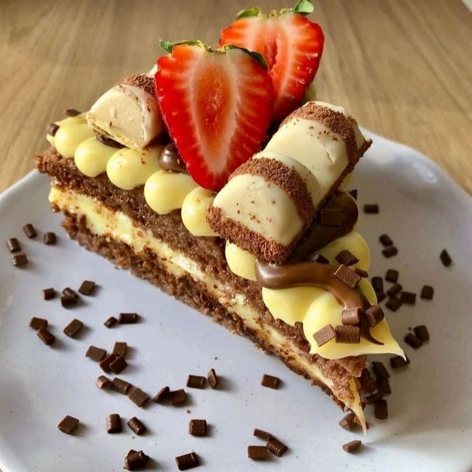 Fatia de bolo de chocolate bem molhadinha com recheio de Ninho, Nutella, bastante Kinder Bueno white e morango. Venha se deliciar com essa super sobremesa