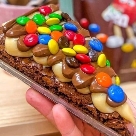 Essa pizza brownie é uma criação exclusiva de nossa loja. Com um pedaço de brownie em formato de fatia de pizza, recheio de Ninho, Nutella e por cima, deliciosos M&M's
