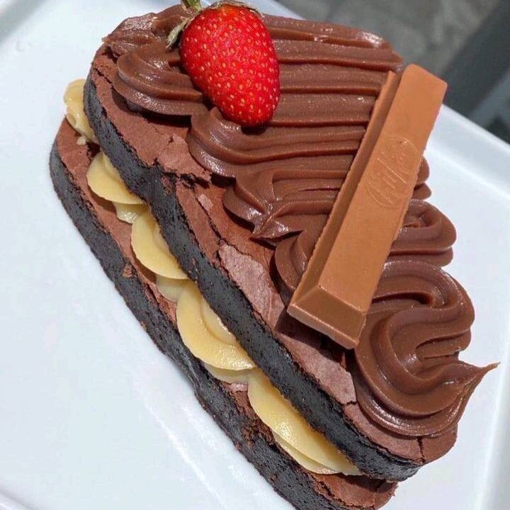 Uma generosa fatia de pizza brownie como base, recheio de Ninho no meio, outra fatia de brownie e brigadeiro e kitkat por cima.