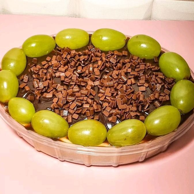 Sobremesa M de uva com APROXIMADAMENTE 700 GRAMAS, com creme de leite ninho, uvas verdes sem sementes e brigadeiro meio amargo. Finalizamos com mais uvas por cima