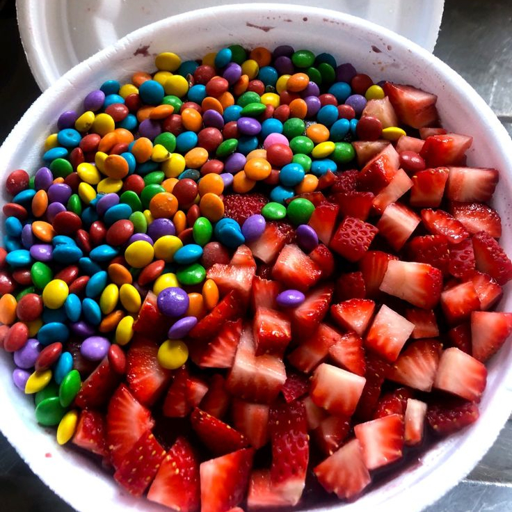 Deliciosa marmita de açaí com 750ml de açaí puro, bastante leite condensado e por cima, Confetti e morangos.