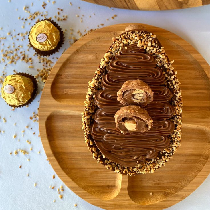 Ovo de colher 150g Ferrero Rocher. Com casca de chocolate meio amargo, recheio de brigadeiro meio amargo, Nutella e amendoim. Finaliza com amendoim e 1 Ferrero Rocher. Peso final pode chegar a 200g