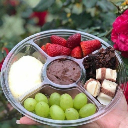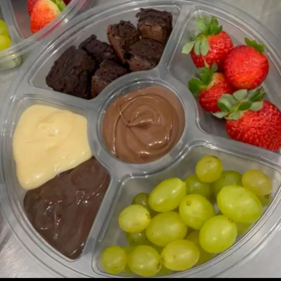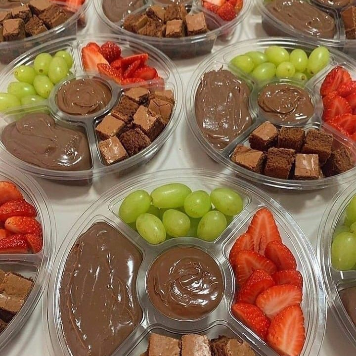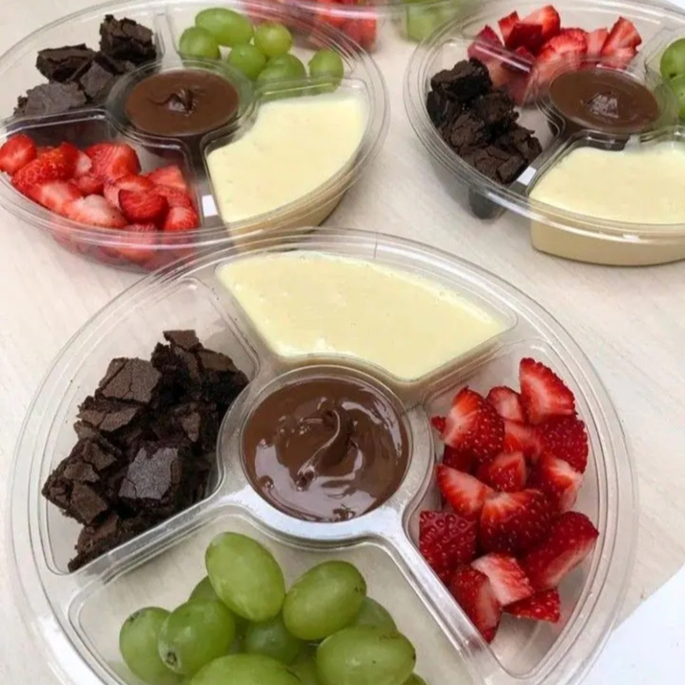 Petisqueira Gourmet com 5 compartimentos sendo eles: uva verde sem sementes, morangos frescos picados, creme de leite ninho, pedaços de Kinder Bueno (white ou ao leite) e pedaços de brownie. No meio, ainda temos Nutella