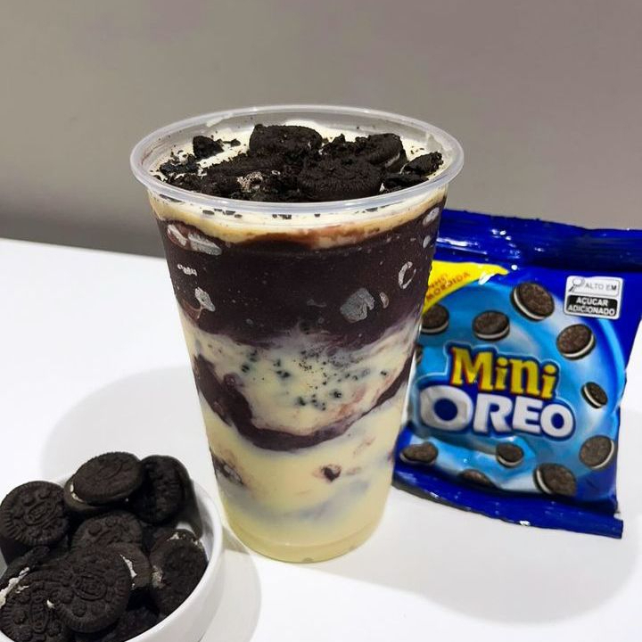 Nesse incrível e completo açaí de Oreo, temos creme de açaí, leite condensado, leite em pó e pedaços de biscoito Oreo. Para finalizar, mais biscoitos Oreo