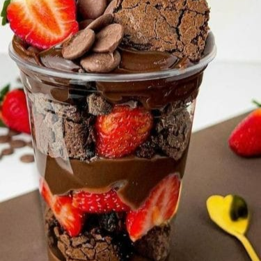 Copo da felicidade de brownie com morango de 200ml. Brigadeiro meio amargo, pedaços debrownie e morangos frescos picados. ( Foto do copo ilustrativa. É possível confirmar os Ml's no próprio copo)
