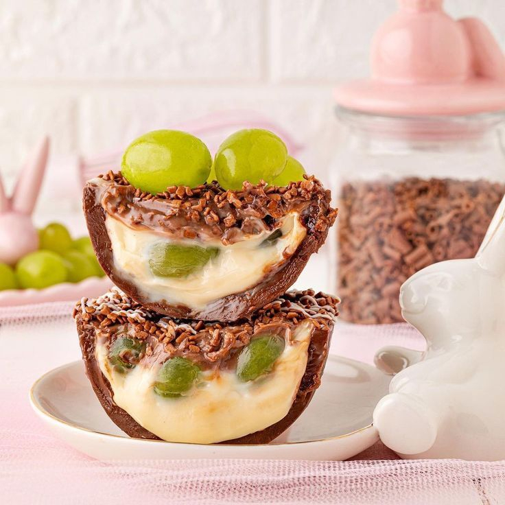 Ovo de colher 150g uva. Com casca de chocolate meio amargo, recheio de ninho, uvas verdes picadas no meio e brigadeiro meio amargo. Finaliza com uva e granulado