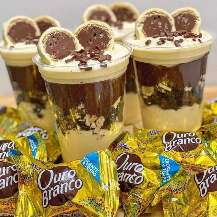 Outro copo muito bem aceito por aqui é esse copo Ouro Branco de 300ml. Com duas camadas de Ninho, duas camadas de brigadeiro e entre elas, dois bombons Ouro Branco picados ao meio. Por cima, temos mais um Ouro Branco e granulê melken para finalizar