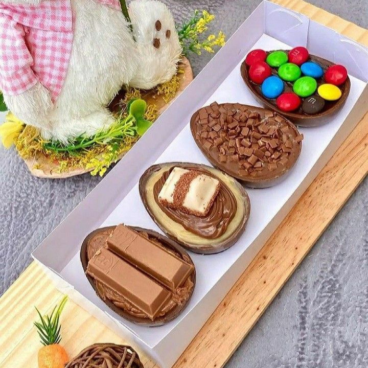 Kit com 4 ovinhos de chocolate meio amargo e um delicioso recheio de: Kitkat - Brigadeiro meio amargo com pedaços de kitkat; Kinder Bueno - Ninho com Nutella e um pedaço de Kinder bueno por cima; Brigadeiro - recheio de brigadeiro meio amargo com granulado e M&M - brigadeiro meio amargo com M&M por cima