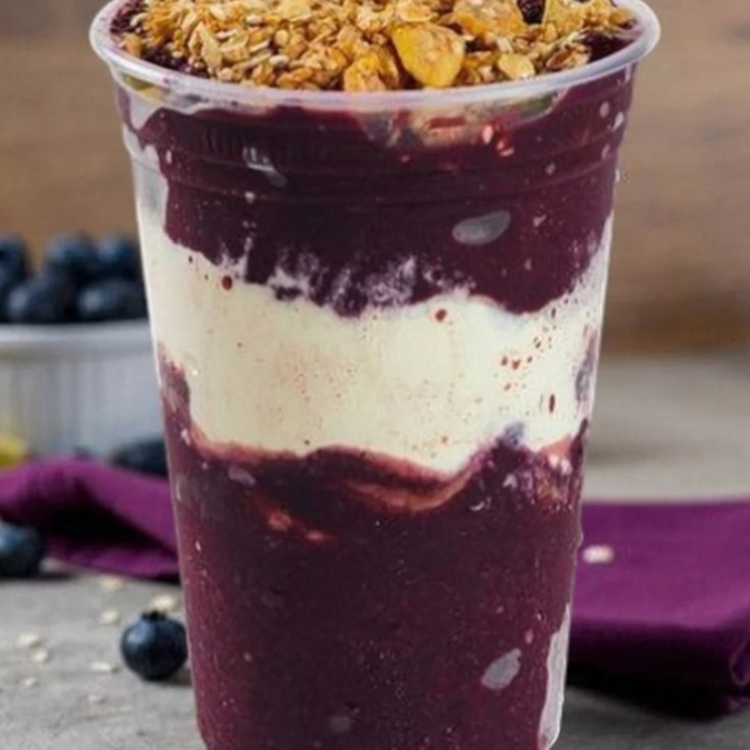 Nesse açaí Tradicional de 500ml temos leite em pó, leite condensado e creme de açaí. Finalizamos com granola por cima