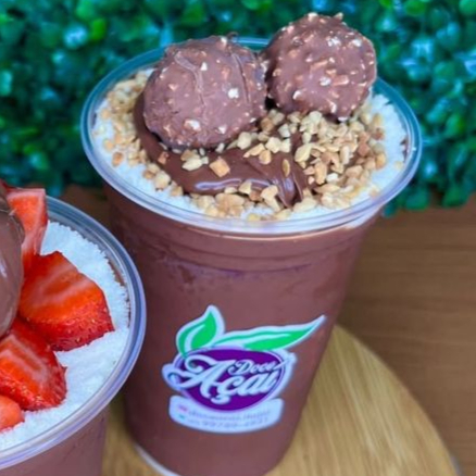 Açaí de 500ml com creme de açai, brigadeiro meio amargo, amendoim, Nutella e finalizando com 1 bombom Ferrero Rocher cortado ao meio
