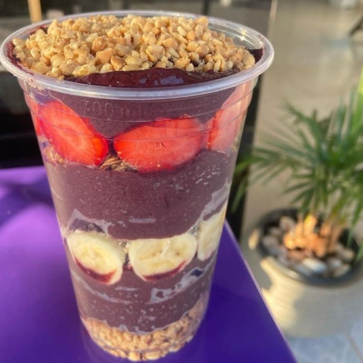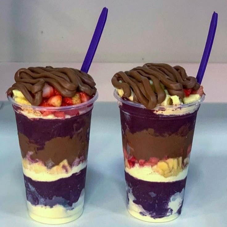Incrível açaí com tudo que você ama. Nele temos creme de açaí, leite em pó, banana em rodelas, morangos e bastante Nutella pura e original