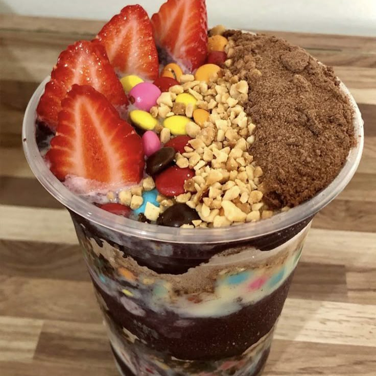 Delicioso açaí de ovomaltine com creme de açaí, Confetti, leite em pó, leite condensado e ovomaltine. Finalizamos com amendoim, morangos, Confetti e mais ovomaltine