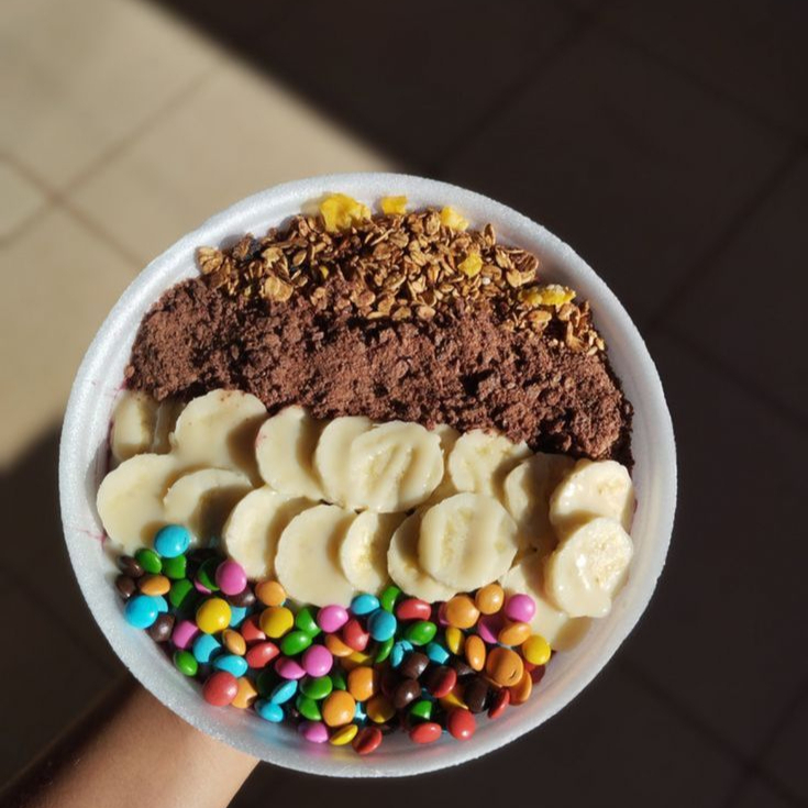 Marmita de 750ml de açaí puro com Confetti, banana, ovomaltine e granola