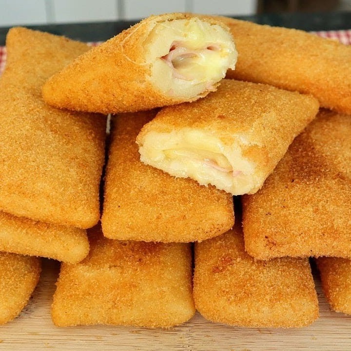 Massa cozida (igual a da coxinha) recheio maravilhoso de presunto, mussarela e orégano. Irresistivelmente boa!