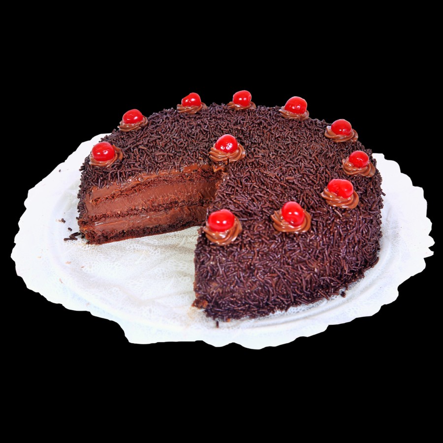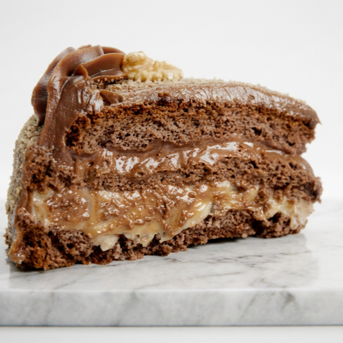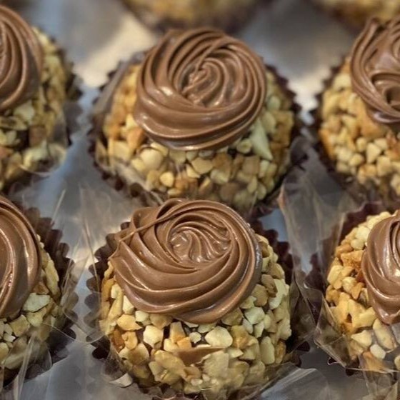 Bolo de chocolate com recheio de brigadeiro e creme de nozes, decorado com chocolate ao leite