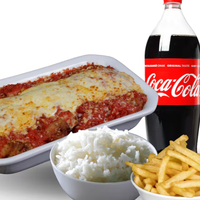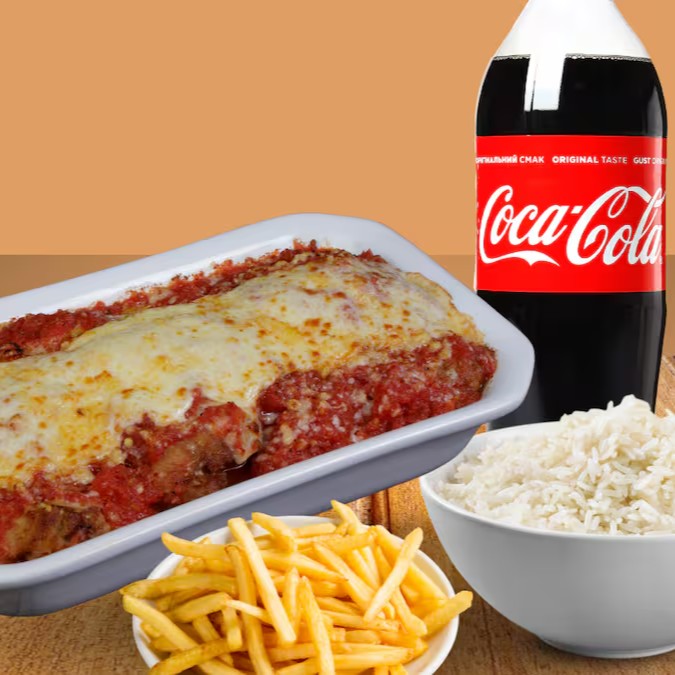 Neste combo são dois deliciosos filés de frango à parmegiana, com uma porção de arroz fresquinho, batata frita e uma Coca-Cola 1l.