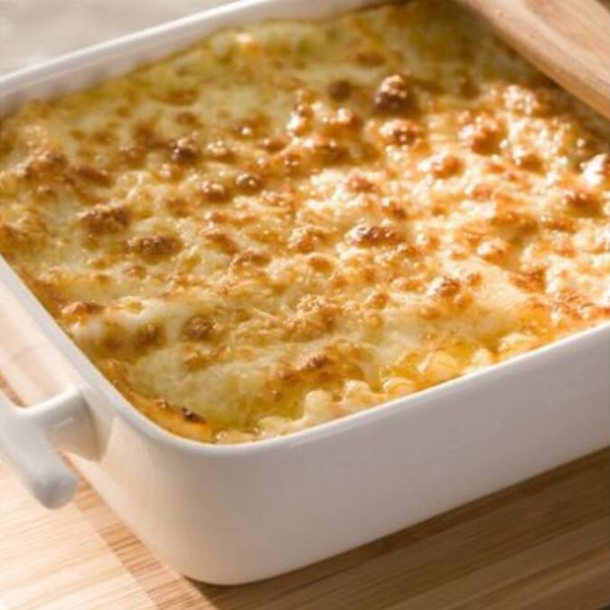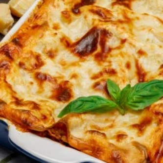 Suculenta lasanha 3 queijos (muçarela, provolone e parmesão), uma camada de molho de tomate artesanal e camadas de molho bechamel feito com ingredientes naturais, gratinada no forno.