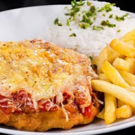 Delicioso filé de frango à parmegiana, com arroz fresquinho e batata frita.