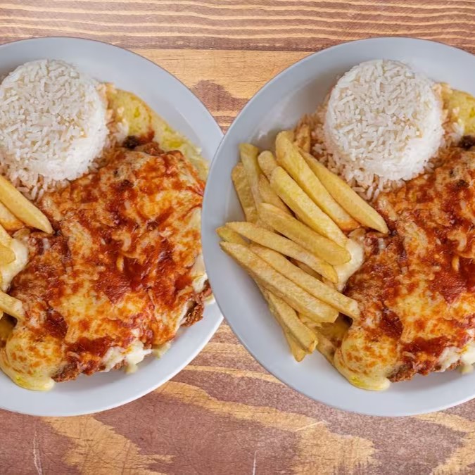 São 2 Filés de frango à parmegiana com molho de tomate artesanal. Acompanha arroz fresquinho e batata frita.
