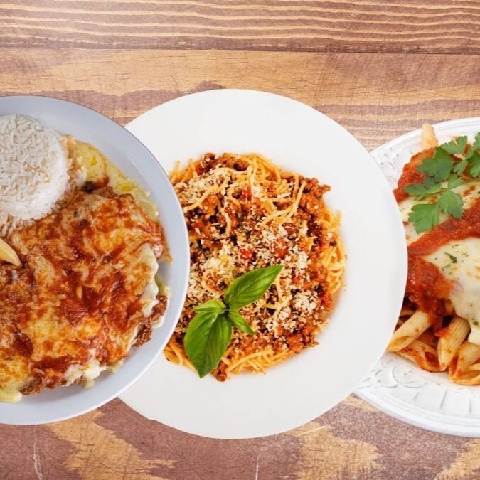 Suculenta lasanha 3 Queijos (muçarela, provolone e parmesão), uma camada de molho de tomate artesanal e camadas de molho bechamel feito com ingredientes naturais.