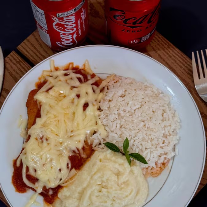 Delicioso filé de frango à parmegiana, com molho de tomate artesanal e mussarela derretida por cima, acompanha arroz fresquinho e batata frita ou purê de batata.