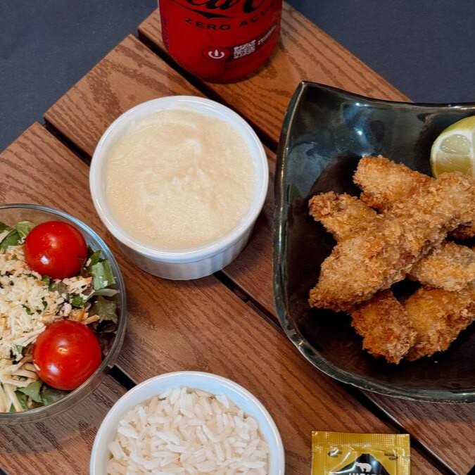 Tilápia em iscas à milanesa, com purê de batata artesanal, arroz fresquinho e salada da casa.