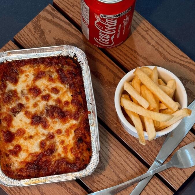 Lasanha 400g gratinada com uma porção de fritas (100g in natura) e uma Coca-Cola lata 350 ml bem gelada!