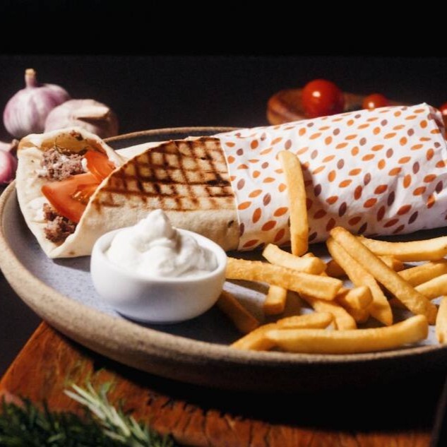 Pão sírio caseiro, pasta de alho, tiras de carne, picles caseiro.